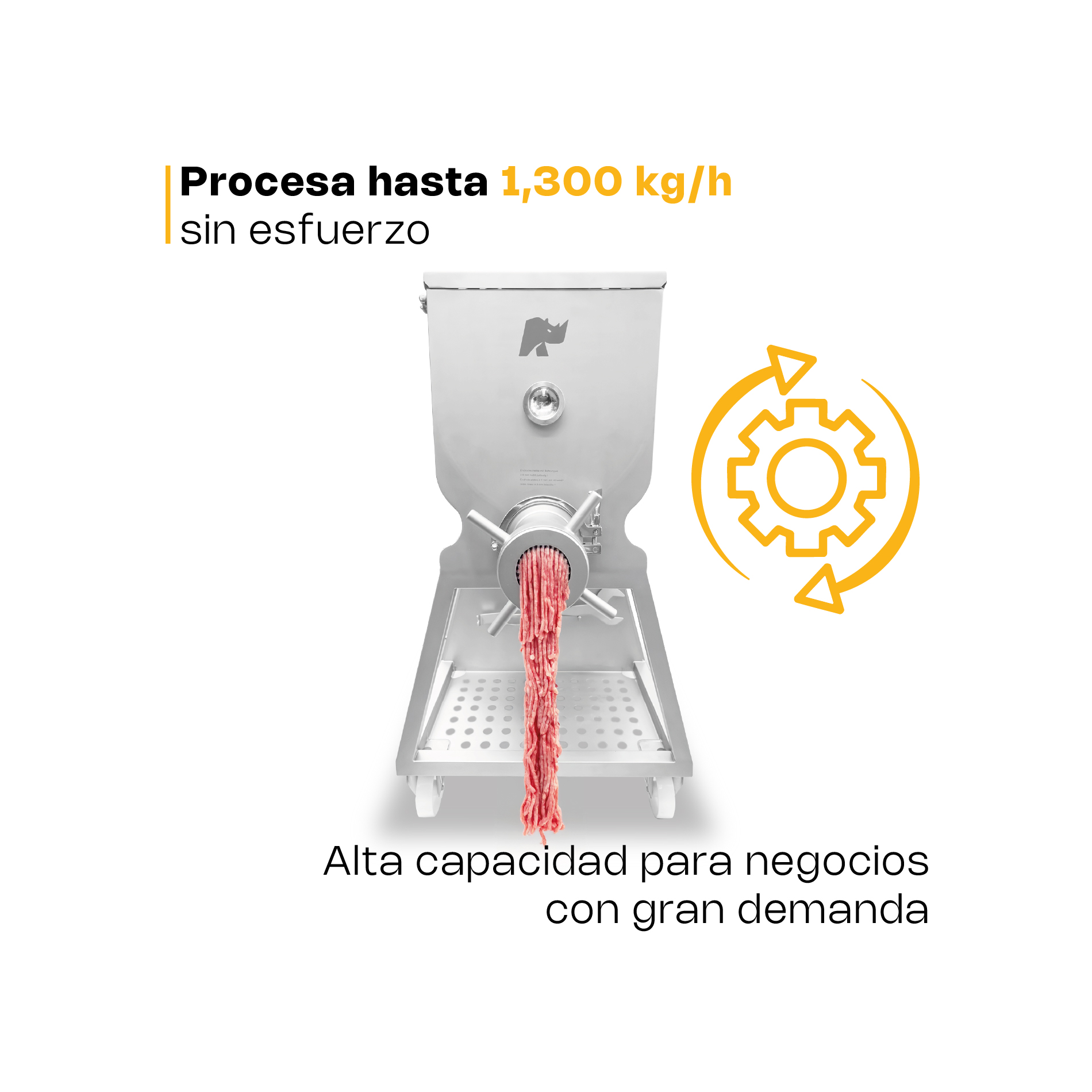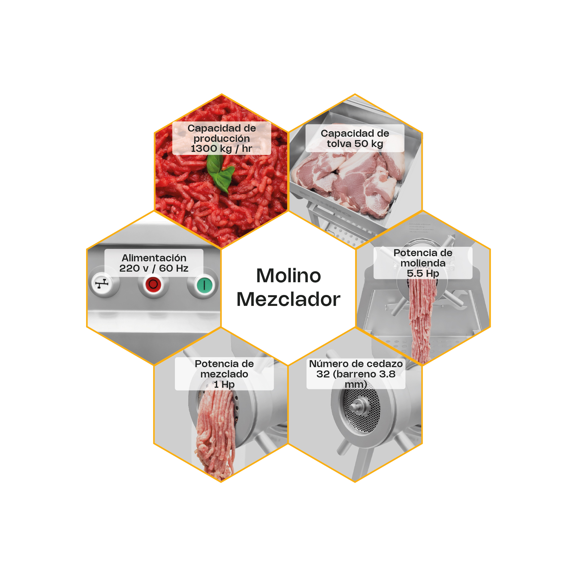 - Potente motor de 5.5 HP para molienda, capaz de procesar hasta 1,300 kg por hora, lo que permite atender una demanda industrial sin interrupciones.