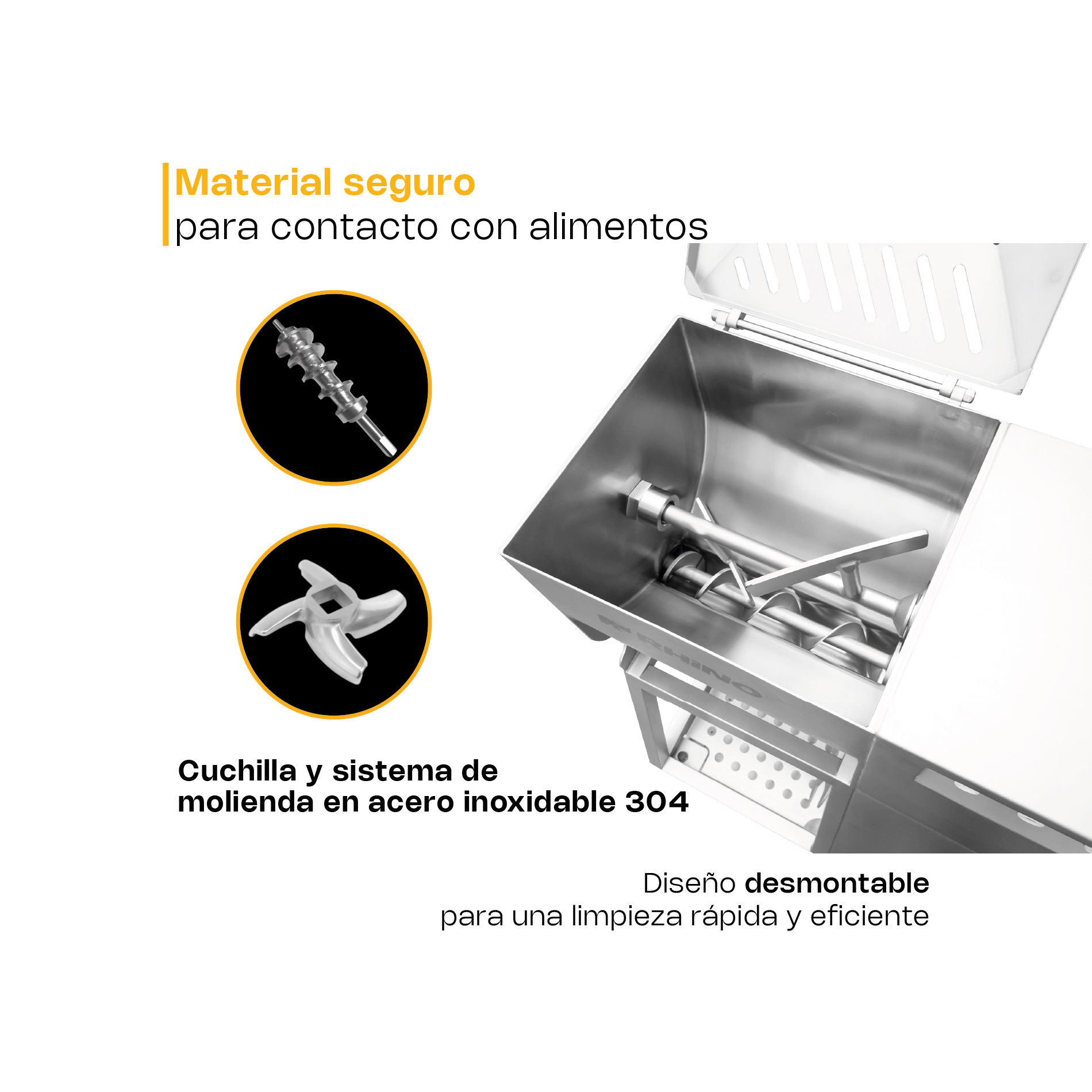 - Área de molienda y mezclado en acero inoxidable 304, garantizando higiene y seguridad en el procesamiento de alimentos, evitando corrosión y contaminación del producto.