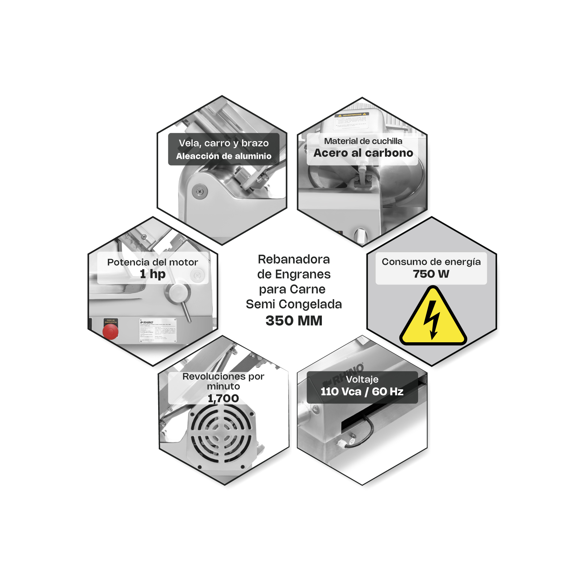 Rebanadora de engranes para carne semi congelada con cuchilla de 350 mm de diámetro, estructura de aleación de aluminio, piedra afiladora de alúmina y cuchilla de acero al carbono. Motor de disco de 1 hp y velocidad de 1,700 rpm. Ancho de rebanadas ajustable de 0.5 a 20 mm